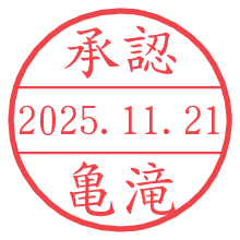 オプションの「電子透かし」をチェックし[生成]すると、見た目には分からないように、UNIXタイムスタンプを識別情報としてPNG形式の日付印に埋め込みます。 日付スタンプメーカーの使い方「部署」「名前」は最大8文字まで入力が可能です。「スタンプの色」を選択し、[生成]ボタン押下で印影画像が更新され、背景を透明に設定したPNG形式とPDF形式の印影画像がリンクからダウンロードできます。 オプションの「電子透かし」は、その性格上日付印ととても相性の良い付加サービスです。 別ページの「タイムスタンプと電子透かし」でも詳しく解説しますが、このオプションを追加することで、日付印が生成された日時に確かにその印が存在していることが証明されます。 ![]() 亀滝さんの電子印鑑が作れます。社内でのデータ書類閲覧確認用など、認印的な使い方のできる電子印鑑が作れます。 ![]() 古代文字で落款印が作れます。「落款スタンプメーカー」で作品を引き立たせる落款印が作れます。