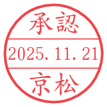 オプションの「電子透かし」をチェックし[生成]すると、見た目には分からないように、UNIXタイムスタンプを識別情報としてPNG形式の日付印に埋め込みます。 日付スタンプメーカーの使い方「部署」「名前」は最大8文字まで入力が可能です。「スタンプの色」を選択し、[生成]ボタン押下で印影画像が更新され、背景を透明に設定したPNG形式とPDF形式の印影画像がリンクからダウンロードできます。 オプションの「電子透かし」は、その性格上日付印ととても相性の良い付加サービスです。 別ページの「タイムスタンプと電子透かし」でも詳しく解説しますが、このオプションを追加することで、日付印が生成された日時に確かにその印が存在していることが証明されます。 ![]() 京松さんの電子印鑑が作れます。社内でのデータ書類閲覧確認用など、認印的な使い方のできる電子印鑑が作れます。 ![]() 古代文字で落款印が作れます。「落款スタンプメーカー」で作品を引き立たせる落款印が作れます。