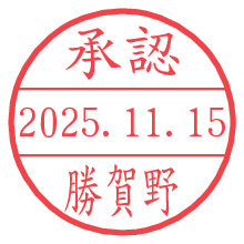オプションの「電子透かし」をチェックし[生成]すると、見た目には分からないように、UNIXタイムスタンプを識別情報としてPNG形式の日付印に埋め込みます。 日付スタンプメーカーの使い方「部署」「名前」は最大8文字まで入力が可能です。「スタンプの色」を選択し、[生成]ボタン押下で印影画像が更新され、背景を透明に設定したPNG形式とPDF形式の印影画像がリンクからダウンロードできます。 オプションの「電子透かし」は、その性格上日付印ととても相性の良い付加サービスです。 別ページの「タイムスタンプと電子透かし」でも詳しく解説しますが、このオプションを追加することで、日付印が生成された日時に確かにその印が存在していることが証明されます。 ![]() 勝賀野さんの電子印鑑が作れます。社内でのデータ書類閲覧確認用など、認印的な使い方のできる電子印鑑が作れます。 ![]() 古代文字で落款印が作れます。「落款スタンプメーカー」で作品を引き立たせる落款印が作れます。