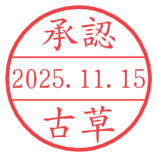 オプションの「電子透かし」をチェックし[生成]すると、見た目には分からないように、UNIXタイムスタンプを識別情報としてPNG形式の日付印に埋め込みます。 日付スタンプメーカーの使い方「部署」「名前」は最大8文字まで入力が可能です。「スタンプの色」を選択し、[生成]ボタン押下で印影画像が更新され、背景を透明に設定したPNG形式とPDF形式の印影画像がリンクからダウンロードできます。 オプションの「電子透かし」は、その性格上日付印ととても相性の良い付加サービスです。 別ページの「タイムスタンプと電子透かし」でも詳しく解説しますが、このオプションを追加することで、日付印が生成された日時に確かにその印が存在していることが証明されます。 ![]() 古草さんの電子印鑑が作れます。社内でのデータ書類閲覧確認用など、認印的な使い方のできる電子印鑑が作れます。 ![]() 古代文字で落款印が作れます。「落款スタンプメーカー」で作品を引き立たせる落款印が作れます。