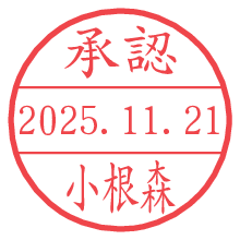 オプションの「電子透かし」をチェックし[生成]すると、見た目には分からないように、UNIXタイムスタンプを識別情報としてPNG形式の日付印に埋め込みます。 日付スタンプメーカーの使い方「部署」「名前」は最大8文字まで入力が可能です。「スタンプの色」を選択し、[生成]ボタン押下で印影画像が更新され、背景を透明に設定したPNG形式とPDF形式の印影画像がリンクからダウンロードできます。 オプションの「電子透かし」は、その性格上日付印ととても相性の良い付加サービスです。 別ページの「タイムスタンプと電子透かし」でも詳しく解説しますが、このオプションを追加することで、日付印が生成された日時に確かにその印が存在していることが証明されます。 ![]() 小根森さんの電子印鑑が作れます。社内でのデータ書類閲覧確認用など、認印的な使い方のできる電子印鑑が作れます。 ![]() 古代文字で落款印が作れます。「落款スタンプメーカー」で作品を引き立たせる落款印が作れます。