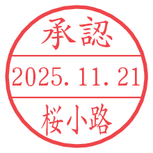 オプションの「電子透かし」をチェックし[生成]すると、見た目には分からないように、UNIXタイムスタンプを識別情報としてPNG形式の日付印に埋め込みます。 日付スタンプメーカーの使い方「部署」「名前」は最大8文字まで入力が可能です。「スタンプの色」を選択し、[生成]ボタン押下で印影画像が更新され、背景を透明に設定したPNG形式とPDF形式の印影画像がリンクからダウンロードできます。 オプションの「電子透かし」は、その性格上日付印ととても相性の良い付加サービスです。 別ページの「タイムスタンプと電子透かし」でも詳しく解説しますが、このオプションを追加することで、日付印が生成された日時に確かにその印が存在していることが証明されます。 ![]() 桜小路さんの電子印鑑が作れます。社内でのデータ書類閲覧確認用など、認印的な使い方のできる電子印鑑が作れます。 ![]() 古代文字で落款印が作れます。「落款スタンプメーカー」で作品を引き立たせる落款印が作れます。