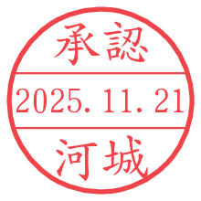 オプションの「電子透かし」をチェックし[生成]すると、見た目には分からないように、UNIXタイムスタンプを識別情報としてPNG形式の日付印に埋め込みます。 日付スタンプメーカーの使い方「部署」「名前」は最大8文字まで入力が可能です。「スタンプの色」を選択し、[生成]ボタン押下で印影画像が更新され、背景を透明に設定したPNG形式とPDF形式の印影画像がリンクからダウンロードできます。 オプションの「電子透かし」は、その性格上日付印ととても相性の良い付加サービスです。 別ページの「タイムスタンプと電子透かし」でも詳しく解説しますが、このオプションを追加することで、日付印が生成された日時に確かにその印が存在していることが証明されます。 ![]() 河城さんの電子印鑑が作れます。社内でのデータ書類閲覧確認用など、認印的な使い方のできる電子印鑑が作れます。 ![]() 古代文字で落款印が作れます。「落款スタンプメーカー」で作品を引き立たせる落款印が作れます。