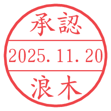 オプションの「電子透かし」をチェックし[生成]すると、見た目には分からないように、UNIXタイムスタンプを識別情報としてPNG形式の日付印に埋め込みます。 日付スタンプメーカーの使い方「部署」「名前」は最大8文字まで入力が可能です。「スタンプの色」を選択し、[生成]ボタン押下で印影画像が更新され、背景を透明に設定したPNG形式とPDF形式の印影画像がリンクからダウンロードできます。 オプションの「電子透かし」は、その性格上日付印ととても相性の良い付加サービスです。 別ページの「タイムスタンプと電子透かし」でも詳しく解説しますが、このオプションを追加することで、日付印が生成された日時に確かにその印が存在していることが証明されます。 ![]() 浪木さんの電子印鑑が作れます。社内でのデータ書類閲覧確認用など、認印的な使い方のできる電子印鑑が作れます。 ![]() 古代文字で落款印が作れます。「落款スタンプメーカー」で作品を引き立たせる落款印が作れます。