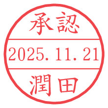 オプションの「電子透かし」をチェックし[生成]すると、見た目には分からないように、UNIXタイムスタンプを識別情報としてPNG形式の日付印に埋め込みます。 日付スタンプメーカーの使い方「部署」「名前」は最大8文字まで入力が可能です。「スタンプの色」を選択し、[生成]ボタン押下で印影画像が更新され、背景を透明に設定したPNG形式とPDF形式の印影画像がリンクからダウンロードできます。 オプションの「電子透かし」は、その性格上日付印ととても相性の良い付加サービスです。 別ページの「タイムスタンプと電子透かし」でも詳しく解説しますが、このオプションを追加することで、日付印が生成された日時に確かにその印が存在していることが証明されます。 ![]() 潤田さんの電子印鑑が作れます。社内でのデータ書類閲覧確認用など、認印的な使い方のできる電子印鑑が作れます。 ![]() 古代文字で落款印が作れます。「落款スタンプメーカー」で作品を引き立たせる落款印が作れます。