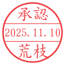 オプションの「電子透かし」をチェックし[生成]すると、見た目には分からないように、UNIXタイムスタンプを識別情報としてPNG形式の日付印に埋め込みます。 日付スタンプメーカーの使い方「部署」「名前」は最大8文字まで入力が可能です。「スタンプの色」を選択し、[生成]ボタン押下で印影画像が更新され、背景を透明に設定したPNG形式とPDF形式の印影画像がリンクからダウンロードできます。 オプションの「電子透かし」は、その性格上日付印ととても相性の良い付加サービスです。 別ページの「タイムスタンプと電子透かし」でも詳しく解説しますが、このオプションを追加することで、日付印が生成された日時に確かにその印が存在していることが証明されます。 ![]() 荒枝さんの電子印鑑が作れます。社内でのデータ書類閲覧確認用など、認印的な使い方のできる電子印鑑が作れます。 ![]() 古代文字で落款印が作れます。「落款スタンプメーカー」で作品を引き立たせる落款印が作れます。