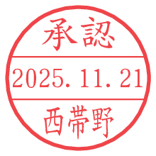 オプションの「電子透かし」をチェックし[生成]すると、見た目には分からないように、UNIXタイムスタンプを識別情報としてPNG形式の日付印に埋め込みます。 日付スタンプメーカーの使い方「部署」「名前」は最大8文字まで入力が可能です。「スタンプの色」を選択し、[生成]ボタン押下で印影画像が更新され、背景を透明に設定したPNG形式とPDF形式の印影画像がリンクからダウンロードできます。 オプションの「電子透かし」は、その性格上日付印ととても相性の良い付加サービスです。 別ページの「タイムスタンプと電子透かし」でも詳しく解説しますが、このオプションを追加することで、日付印が生成された日時に確かにその印が存在していることが証明されます。 ![]() 西帯野さんの電子印鑑が作れます。社内でのデータ書類閲覧確認用など、認印的な使い方のできる電子印鑑が作れます。 ![]() 古代文字で落款印が作れます。「落款スタンプメーカー」で作品を引き立たせる落款印が作れます。