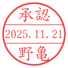 オプションの「電子透かし」をチェックし[生成]すると、見た目には分からないように、UNIXタイムスタンプを識別情報としてPNG形式の日付印に埋め込みます。 日付スタンプメーカーの使い方「部署」「名前」は最大8文字まで入力が可能です。「スタンプの色」を選択し、[生成]ボタン押下で印影画像が更新され、背景を透明に設定したPNG形式とPDF形式の印影画像がリンクからダウンロードできます。 オプションの「電子透かし」は、その性格上日付印ととても相性の良い付加サービスです。 別ページの「タイムスタンプと電子透かし」でも詳しく解説しますが、このオプションを追加することで、日付印が生成された日時に確かにその印が存在していることが証明されます。 ![]() 野亀さんの電子印鑑が作れます。社内でのデータ書類閲覧確認用など、認印的な使い方のできる電子印鑑が作れます。 ![]() 古代文字で落款印が作れます。「落款スタンプメーカー」で作品を引き立たせる落款印が作れます。