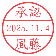 オプションの「電子透かし」をチェックし[生成]すると、見た目には分からないように、UNIXタイムスタンプを識別情報としてPNG形式の日付印に埋め込みます。 日付スタンプメーカーの使い方「部署」「名前」は最大8文字まで入力が可能です。「スタンプの色」を選択し、[生成]ボタン押下で印影画像が更新され、背景を透明に設定したPNG形式とPDF形式の印影画像がリンクからダウンロードできます。 オプションの「電子透かし」は、その性格上日付印ととても相性の良い付加サービスです。 別ページの「電子透かしとタイムスタンプ」でも詳しく解説しますが、このオプションを追加することで、日付印が生成された日時に確かにその印が存在していることが証明されます。 ![]()  風藤さんの電子印鑑が作れます。社内でのデータ書類閲覧確認用など、認印的な使い方のできる電子印鑑が作れます。 ![]()  古代文字で落款印が作れます。「落款スタンプメーカー」で作品を引き立たせる落款印が作れます。