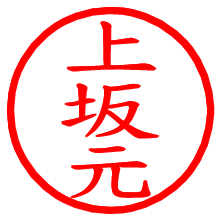 [朱肉の色]を選び、入力窓に“上坂元”と入力して[生成]ボタンを押すと、印影が更新され、リンクから電子印鑑(デジタル印影)がダウンロードできます。 電子印鑑「上坂元」の作り方文字表示が変なときや、文字バランスが悪いときは[字形切替]のチェックボックスでON/OFFを切り替え[生成]しなおしてください。 生成される画像は通常の印影「上坂元.png」と、にじみを表現した少し太めの印影「上坂元B.png」の背面透過PNG形式2種と、鮮明なPDF形式の印影「上坂元.pdf」の計3種類です。 朱肉の微妙な色の違いを7色で表現しました。デフォルト(左端)は、JISが定めた朱肉の色のマンセル値(7.5R 5/14)をRGB値(217,66,54)に変換したものになっています。 「電子透かし」にチェックを入れて[生成]ボタンを押すと、タイムスタンプを電子透かしとして埋め込んだセキュアな電子印鑑が作れます。詳細は別ページの「タイムスタンプと電子透かし」でご覧ください。 上坂元さんの日付印が作れます。「日付スタンプメーカー」は、社内向けの書類に利用されることの多い日付印(データ印)が無料で作れるWebアプリケーションです。中段に日付が入り、上段と下段は、ともに8文字まで文字が入ります。 ![]() 古代文字で落款印が作れます。「落款スタンプメーカー」で作品を引き立たせる落款印が作れます。