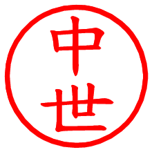 [朱肉の色]を選び、入力窓に“中世”と入力して[生成]ボタンを押すと、印影が更新され、リンクから電子印鑑(デジタル印影)がダウンロードできます。 電子印鑑「中世」の作り方文字表示が変なときや、文字バランスが悪いときは[字形切替]のチェックボックスでON/OFFを切り替え[生成]しなおしてください。 生成される画像は通常の印影「中世.png」と、にじみを表現した少し太めの印影「中世B.png」の背面透過PNG形式2種と、鮮明なPDF形式の印影「中世.pdf」の計3種類です。 朱肉の微妙な色の違いを7色で表現しました。デフォルト(左端)は、JISが定めた朱肉の色のマンセル値(7.5R 5/14)をRGB値(217,66,54)に変換したものになっています。 「電子透かし」にチェックを入れて[生成]ボタンを押すと、タイムスタンプを透かしとして埋め込んだセキュアな電子印鑑が作れます。詳細は別ページの「電子透かしとタイムスタンプ」でご覧ください。 中世さんの日付印が作れます。「日付スタンプメーカー」は、社内向けの書類に利用されることの多い日付印(データ印)が無料で作れるWebアプリケーションです。中段に日付が入り、上段と下段は、ともに8文字まで文字が入ります。 ![]() 古代文字で落款印が作れます。「落款スタンプメーカー」で作品を引き立たせる落款印が作れます。