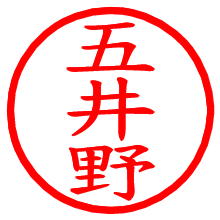 [朱肉の色]を選び、入力窓に“五井野”と入力して[生成]ボタンを押すと、印影が更新され、リンクから電子印鑑(デジタル印影)がダウンロードできます。 電子印鑑「五井野」の作り方文字表示が変なときや、文字バランスが悪いときは[字形切替]のチェックボックスでON/OFFを切り替え[生成]しなおしてください。 生成される画像は通常の印影「五井野.png」と、にじみを表現した少し太めの印影「五井野B.png」の背面透過PNG形式2種と、鮮明なPDF形式の印影「五井野.pdf」の計3種類です。 朱肉の微妙な色の違いを7色で表現しました。デフォルト(左端)は、JISが定めた朱肉の色のマンセル値(7.5R 5/14)をRGB値(217,66,54)に変換したものになっています。 「電子透かし」にチェックを入れて[生成]ボタンを押すと、タイムスタンプを透かしとして埋め込んだセキュアな電子印鑑が作れます。詳細は別ページの「電子透かしとタイムスタンプ」でご覧ください。 五井野さんの日付印が作れます。「日付スタンプメーカー」は、社内向けの書類に利用されることの多い日付印(データ印)が無料で作れるWebアプリケーションです。中段に日付が入り、上段と下段は、ともに8文字まで文字が入ります。 ![]() 古代文字で落款印が作れます。「落款スタンプメーカー」で作品を引き立たせる落款印が作れます。