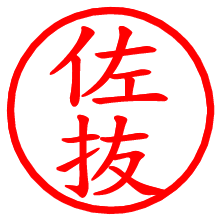 [朱肉の色]を選び、入力窓に“佐抜”と入力して[生成]ボタンを押すと、印影が更新され、リンクから電子印鑑(デジタル印影)がダウンロードできます。 電子印鑑「佐抜」の作り方文字表示が変なときや、文字バランスが悪いときは[字形切替]のチェックボックスでON/OFFを切り替え[生成]しなおしてください。 生成される画像は通常の印影「佐抜.png」と、にじみを表現した少し太めの印影「佐抜B.png」の背面透過PNG形式2種と、鮮明なPDF形式の印影「佐抜.pdf」の計3種類です。 朱肉の微妙な色の違いを7色で表現しました。デフォルト(左端)は、JISが定めた朱肉の色のマンセル値(7.5R 5/14)をRGB値(217,66,54)に変換したものになっています。 「電子透かし」にチェックを入れて[生成]ボタンを押すと、タイムスタンプを電子透かしとして埋め込んだセキュアな電子印鑑が作れます。詳細は別ページの「タイムスタンプと電子透かし」でご覧ください。 佐抜さんの日付印が作れます。「日付スタンプメーカー」は、社内向けの書類に利用されることの多い日付印(データ印)が無料で作れるWebアプリケーションです。中段に日付が入り、上段と下段は、ともに8文字まで文字が入ります。 ![]() 古代文字で落款印が作れます。「落款スタンプメーカー」で作品を引き立たせる落款印が作れます。