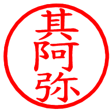 [朱肉の色]を選び、入力窓に“其阿弥”と入力して[生成]ボタンを押すと、印影が更新され、リンクから電子印鑑(デジタル印影)がダウンロードできます。 電子印鑑「其阿弥」の作り方文字表示が変なときや、文字バランスが悪いときは[字形切替]のチェックボックスでON/OFFを切り替え[生成]しなおしてください。 生成される画像は通常の印影「其阿弥.png」と、にじみを表現した少し太めの印影「其阿弥B.png」の背面透過PNG形式2種と、鮮明なPDF形式の印影「其阿弥.pdf」の計3種類です。 朱肉の微妙な色の違いを7色で表現しました。デフォルト(左端)は、JISが定めた朱肉の色のマンセル値(7.5R 5/14)をRGB値(217,66,54)に変換したものになっています。 「電子透かし」にチェックを入れて[生成]ボタンを押すと、タイムスタンプを電子透かしとして埋め込んだセキュアな電子印鑑が作れます。詳細は別ページの「タイムスタンプと電子透かし」でご覧ください。 其阿弥さんの日付印が作れます。「日付スタンプメーカー」は、社内向けの書類に利用されることの多い日付印(データ印)が無料で作れるWebアプリケーションです。中段に日付が入り、上段と下段は、ともに8文字まで文字が入ります。 ![]() 古代文字で落款印が作れます。「落款スタンプメーカー」で作品を引き立たせる落款印が作れます。