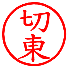 [朱肉の色]を選び、入力窓に“切東”と入力して[生成]ボタンを押すと、印影が更新され、リンクから電子印鑑(デジタル印影)がダウンロードできます。 電子印鑑「切東」の作り方文字表示が変なときや、文字バランスが悪いときは[字形切替]のチェックボックスでON/OFFを切り替え[生成]しなおしてください。 生成される画像は通常の印影「切東.png」と、にじみを表現した少し太めの印影「切東B.png」の背面透過PNG形式2種と、鮮明なPDF形式の印影「切東.pdf」の計3種類です。 朱肉の微妙な色の違いを7色で表現しました。デフォルト(左端)は、JISが定めた朱肉の色のマンセル値(7.5R 5/14)をRGB値(217,66,54)に変換したものになっています。 「電子透かし」にチェックを入れて[生成]ボタンを押すと、タイムスタンプを透かしとして埋め込んだセキュアな電子印鑑が作れます。詳細は別ページの「電子透かしとタイムスタンプ」でご覧ください。  切東さんの日付印が作れます。「日付スタンプメーカー」は、社内向けの書類に利用されることの多い日付印(データ印)が無料で作れるWebアプリケーションです。中段に日付が入り、上段と下段は、ともに8文字まで文字が入ります。 ![]()  古代文字で落款印が作れます。「落款スタンプメーカー」で作品を引き立たせる落款印が作れます。