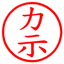 [朱肉の色]を選び、入力窓に“力示”と入力して[生成]ボタンを押すと、印影が更新され、リンクから電子印鑑(デジタル印影)がダウンロードできます。 電子印鑑「力示」の作り方文字表示が変なときや、文字バランスが悪いときは[字形切替]のチェックボックスでON/OFFを切り替え[生成]しなおしてください。 生成される画像は通常の印影「力示.png」と、にじみを表現した少し太めの印影「力示B.png」の背面透過PNG形式2種と、鮮明なPDF形式の印影「力示.pdf」の計3種類です。 朱肉の微妙な色の違いを7色で表現しました。デフォルト(左端)は、JISが定めた朱肉の色のマンセル値(7.5R 5/14)をRGB値(217,66,54)に変換したものになっています。 「電子透かし」にチェックを入れて[生成]ボタンを押すと、タイムスタンプを電子透かしとして埋め込んだセキュアな電子印鑑が作れます。詳細は別ページの「タイムスタンプと電子透かし」でご覧ください。 力示さんの日付印が作れます。「日付スタンプメーカー」は、社内向けの書類に利用されることの多い日付印(データ印)が無料で作れるWebアプリケーションです。中段に日付が入り、上段と下段は、ともに8文字まで文字が入ります。 ![]() 古代文字で落款印が作れます。「落款スタンプメーカー」で作品を引き立たせる落款印が作れます。