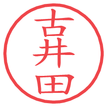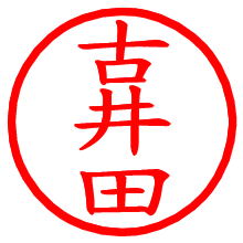 [朱肉の色]を選び、入力窓に“古井田”と入力して[生成]ボタンを押すと、印影が更新され、リンクから電子印鑑(デジタル印影)がダウンロードできます。 電子印鑑「古井田」の作り方文字表示が変なときや、文字バランスが悪いときは[字形切替]のチェックボックスでON/OFFを切り替え[生成]しなおしてください。 生成される画像は通常の印影「古井田.png」と、にじみを表現した少し太めの印影「古井田B.png」の背面透過PNG形式2種と、鮮明なPDF形式の印影「古井田.pdf」の計3種類です。 朱肉の微妙な色の違いを7色で表現しました。デフォルト(左端)は、JISが定めた朱肉の色のマンセル値(7.5R 5/14)をRGB値(217,66,54)に変換したものになっています。 「電子透かし」にチェックを入れて[生成]ボタンを押すと、タイムスタンプを電子透かしとして埋め込んだセキュアな電子印鑑が作れます。詳細は別ページの「タイムスタンプと電子透かし」でご覧ください。 古井田さんの日付印が作れます。「日付スタンプメーカー」は、社内向けの書類に利用されることの多い日付印(データ印)が無料で作れるWebアプリケーションです。中段に日付が入り、上段と下段は、ともに8文字まで文字が入ります。 ![]() 古代文字で落款印が作れます。「落款スタンプメーカー」で作品を引き立たせる落款印が作れます。