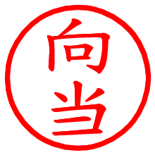 [朱肉の色]を選び、入力窓に“向当”と入力して[生成]ボタンを押すと、印影が更新され、リンクから電子印鑑(デジタル印影)がダウンロードできます。 電子印鑑「向当」の作り方文字表示が変なときや、文字バランスが悪いときは[字形切替]のチェックボックスでON/OFFを切り替え[生成]しなおしてください。 生成される画像は通常の印影「向当.png」と、にじみを表現した少し太めの印影「向当B.png」の背面透過PNG形式2種と、鮮明なPDF形式の印影「向当.pdf」の計3種類です。 朱肉の微妙な色の違いを7色で表現しました。デフォルト(左端)は、JISが定めた朱肉の色のマンセル値(7.5R 5/14)をRGB値(217,66,54)に変換したものになっています。 「電子透かし」にチェックを入れて[生成]ボタンを押すと、タイムスタンプを透かしとして埋め込んだセキュアな電子印鑑が作れます。詳細は別ページの「電子透かしとタイムスタンプ」でご覧ください。  向当さんの日付印が作れます。「日付スタンプメーカー」は、社内向けの書類に利用されることの多い日付印(データ印)が無料で作れるWebアプリケーションです。中段に日付が入り、上段と下段は、ともに8文字まで文字が入ります。 ![]()  古代文字で落款印が作れます。「落款スタンプメーカー」で作品を引き立たせる落款印が作れます。