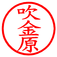 [朱肉の色]を選び、入力窓に“吹金原”と入力して[生成]ボタンを押すと、印影が更新され、リンクから電子印鑑(デジタル印影)がダウンロードできます。 電子印鑑「吹金原」の作り方文字表示が変なときや、文字バランスが悪いときは[字形切替]のチェックボックスでON/OFFを切り替え[生成]しなおしてください。 生成される画像は通常の印影「吹金原.png」と、にじみを表現した少し太めの印影「吹金原B.png」の背面透過PNG形式2種と、鮮明なPDF形式の印影「吹金原.pdf」の計3種類です。 朱肉の微妙な色の違いを7色で表現しました。デフォルト(左端)は、JISが定めた朱肉の色のマンセル値(7.5R 5/14)をRGB値(217,66,54)に変換したものになっています。 「電子透かし」にチェックを入れて[生成]ボタンを押すと、タイムスタンプを電子透かしとして埋め込んだセキュアな電子印鑑が作れます。詳細は別ページの「タイムスタンプと電子透かし」でご覧ください。 吹金原さんの日付印が作れます。「日付スタンプメーカー」は、社内向けの書類に利用されることの多い日付印(データ印)が無料で作れるWebアプリケーションです。中段に日付が入り、上段と下段は、ともに8文字まで文字が入ります。 ![]() 古代文字で落款印が作れます。「落款スタンプメーカー」で作品を引き立たせる落款印が作れます。