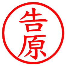 [朱肉の色]を選び、入力窓に“告原”と入力して[生成]ボタンを押すと、印影が更新され、リンクから電子印鑑(デジタル印影)がダウンロードできます。 電子印鑑「告原」の作り方文字表示が変なときや、文字バランスが悪いときは[字形切替]のチェックボックスでON/OFFを切り替え[生成]しなおしてください。 生成される画像は通常の印影「告原.png」と、にじみを表現した少し太めの印影「告原B.png」の背面透過PNG形式2種と、鮮明なPDF形式の印影「告原.pdf」の計3種類です。 朱肉の微妙な色の違いを7色で表現しました。デフォルト(左端)は、JISが定めた朱肉の色のマンセル値(7.5R 5/14)をRGB値(217,66,54)に変換したものになっています。 「電子透かし」にチェックを入れて[生成]ボタンを押すと、タイムスタンプを電子透かしとして埋め込んだセキュアな電子印鑑が作れます。詳細は別ページの「タイムスタンプと電子透かし」でご覧ください。 告原さんの日付印が作れます。「日付スタンプメーカー」は、社内向けの書類に利用されることの多い日付印(データ印)が無料で作れるWebアプリケーションです。中段に日付が入り、上段と下段は、ともに8文字まで文字が入ります。 ![]() 古代文字で落款印が作れます。「落款スタンプメーカー」で作品を引き立たせる落款印が作れます。