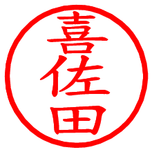 [朱肉の色]を選び、入力窓に“喜佐田”と入力して[生成]ボタンを押すと、印影が更新され、リンクから電子印鑑(デジタル印影)がダウンロードできます。 電子印鑑「喜佐田」の作り方文字表示が変なときや、文字バランスが悪いときは[字形切替]のチェックボックスでON/OFFを切り替え[生成]しなおしてください。 生成される画像は通常の印影「喜佐田.png」と、にじみを表現した少し太めの印影「喜佐田B.png」の背面透過PNG形式2種と、鮮明なPDF形式の印影「喜佐田.pdf」の計3種類です。 朱肉の微妙な色の違いを7色で表現しました。デフォルト(左端)は、JISが定めた朱肉の色のマンセル値(7.5R 5/14)をRGB値(217,66,54)に変換したものになっています。 「電子透かし」にチェックを入れて[生成]ボタンを押すと、タイムスタンプを電子透かしとして埋め込んだセキュアな電子印鑑が作れます。詳細は別ページの「タイムスタンプと電子透かし」でご覧ください。 喜佐田さんの日付印が作れます。「日付スタンプメーカー」は、社内向けの書類に利用されることの多い日付印(データ印)が無料で作れるWebアプリケーションです。中段に日付が入り、上段と下段は、ともに8文字まで文字が入ります。 ![]() 古代文字で落款印が作れます。「落款スタンプメーカー」で作品を引き立たせる落款印が作れます。