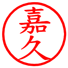 [朱肉の色]を選び、入力窓に“嘉久”と入力して[生成]ボタンを押すと、印影が更新され、リンクから電子印鑑(デジタル印影)がダウンロードできます。 電子印鑑「嘉久」の作り方文字表示が変なときや、文字バランスが悪いときは[字形切替]のチェックボックスでON/OFFを切り替え[生成]しなおしてください。 生成される画像は通常の印影「嘉久.png」と、にじみを表現した少し太めの印影「嘉久B.png」の背面透過PNG形式2種と、鮮明なPDF形式の印影「嘉久.pdf」の計3種類です。 朱肉の微妙な色の違いを7色で表現しました。デフォルト(左端)は、JISが定めた朱肉の色のマンセル値(7.5R 5/14)をRGB値(217,66,54)に変換したものになっています。 「電子透かし」にチェックを入れて[生成]ボタンを押すと、タイムスタンプを電子透かしとして埋め込んだセキュアな電子印鑑が作れます。詳細は別ページの「タイムスタンプと電子透かし」でご覧ください。 嘉久さんの日付印が作れます。「日付スタンプメーカー」は、社内向けの書類に利用されることの多い日付印(データ印)が無料で作れるWebアプリケーションです。中段に日付が入り、上段と下段は、ともに8文字まで文字が入ります。 ![]() 古代文字で落款印が作れます。「落款スタンプメーカー」で作品を引き立たせる落款印が作れます。