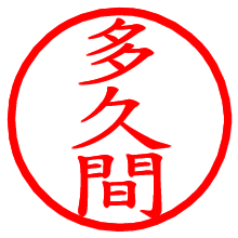 [朱肉の色]を選び、入力窓に“多久間”と入力して[生成]ボタンを押すと、印影が更新され、リンクから電子印鑑(デジタル印影)がダウンロードできます。 電子印鑑「多久間」の作り方文字表示が変なときや、文字バランスが悪いときは[字形切替]のチェックボックスでON/OFFを切り替え[生成]しなおしてください。 生成される画像は通常の印影「多久間.png」と、にじみを表現した少し太めの印影「多久間B.png」の背面透過PNG形式2種と、鮮明なPDF形式の印影「多久間.pdf」の計3種類です。 朱肉の微妙な色の違いを7色で表現しました。デフォルト(左端)は、JISが定めた朱肉の色のマンセル値(7.5R 5/14)をRGB値(217,66,54)に変換したものになっています。 「電子透かし」にチェックを入れて[生成]ボタンを押すと、タイムスタンプを透かしとして埋め込んだセキュアな電子印鑑が作れます。詳細は別ページの「電子透かしとタイムスタンプ」でご覧ください。  多久間さんの日付印が作れます。「日付スタンプメーカー」は、社内向けの書類に利用されることの多い日付印(データ印)が無料で作れるWebアプリケーションです。中段に日付が入り、上段と下段は、ともに8文字まで文字が入ります。 ![]()  古代文字で落款印が作れます。「落款スタンプメーカー」で作品を引き立たせる落款印が作れます。