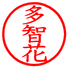 [朱肉の色]を選び、入力窓に“多智花”と入力して[生成]ボタンを押すと、印影が更新され、リンクから電子印鑑(デジタル印影)がダウンロードできます。 電子印鑑「多智花」の作り方文字表示が変なときや、文字バランスが悪いときは[字形切替]のチェックボックスでON/OFFを切り替え[生成]しなおしてください。 生成される画像は通常の印影「多智花.png」と、にじみを表現した少し太めの印影「多智花B.png」の背面透過PNG形式2種と、鮮明なPDF形式の印影「多智花.pdf」の計3種類です。 朱肉の微妙な色の違いを7色で表現しました。デフォルト(左端)は、JISが定めた朱肉の色のマンセル値(7.5R 5/14)をRGB値(217,66,54)に変換したものになっています。 「電子透かし」にチェックを入れて[生成]ボタンを押すと、タイムスタンプを電子透かしとして埋め込んだセキュアな電子印鑑が作れます。詳細は別ページの「タイムスタンプと電子透かし」でご覧ください。 多智花さんの日付印が作れます。「日付スタンプメーカー」は、社内向けの書類に利用されることの多い日付印(データ印)が無料で作れるWebアプリケーションです。中段に日付が入り、上段と下段は、ともに8文字まで文字が入ります。 ![]() 古代文字で落款印が作れます。「落款スタンプメーカー」で作品を引き立たせる落款印が作れます。