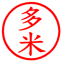 [朱肉の色]を選び、入力窓に“多米”と入力して[生成]ボタンを押すと、印影が更新され、リンクから電子印鑑(デジタル印影)がダウンロードできます。 電子印鑑「多米」の作り方文字表示が変なときや、文字バランスが悪いときは[字形切替]のチェックボックスでON/OFFを切り替え[生成]しなおしてください。 生成される画像は通常の印影「多米.png」と、にじみを表現した少し太めの印影「多米B.png」の背面透過PNG形式2種と、鮮明なPDF形式の印影「多米.pdf」の計3種類です。 朱肉の微妙な色の違いを7色で表現しました。デフォルト(左端)は、JISが定めた朱肉の色のマンセル値(7.5R 5/14)をRGB値(217,66,54)に変換したものになっています。 「電子透かし」にチェックを入れて[生成]ボタンを押すと、タイムスタンプを電子透かしとして埋め込んだセキュアな電子印鑑が作れます。詳細は別ページの「タイムスタンプと電子透かし」でご覧ください。 多米さんの日付印が作れます。「日付スタンプメーカー」は、社内向けの書類に利用されることの多い日付印(データ印)が無料で作れるWebアプリケーションです。中段に日付が入り、上段と下段は、ともに8文字まで文字が入ります。 ![]() 古代文字で落款印が作れます。「落款スタンプメーカー」で作品を引き立たせる落款印が作れます。