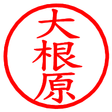 [朱肉の色]を選び、入力窓に“大根原”と入力して[生成]ボタンを押すと、印影が更新され、リンクから電子印鑑(デジタル印影)がダウンロードできます。 電子印鑑「大根原」の作り方文字表示が変なときや、文字バランスが悪いときは[字形切替]のチェックボックスでON/OFFを切り替え[生成]しなおしてください。 生成される画像は通常の印影「大根原.png」と、にじみを表現した少し太めの印影「大根原B.png」の背面透過PNG形式2種と、鮮明なPDF形式の印影「大根原.pdf」の計3種類です。 朱肉の微妙な色の違いを7色で表現しました。デフォルト(左端)は、JISが定めた朱肉の色のマンセル値(7.5R 5/14)をRGB値(217,66,54)に変換したものになっています。 「電子透かし」にチェックを入れて[生成]ボタンを押すと、タイムスタンプを電子透かしとして埋め込んだセキュアな電子印鑑が作れます。詳細は別ページの「タイムスタンプと電子透かし」でご覧ください。 大根原さんの日付印が作れます。「日付スタンプメーカー」は、社内向けの書類に利用されることの多い日付印(データ印)が無料で作れるWebアプリケーションです。中段に日付が入り、上段と下段は、ともに8文字まで文字が入ります。 ![]() 古代文字で落款印が作れます。「落款スタンプメーカー」で作品を引き立たせる落款印が作れます。