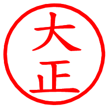 [朱肉の色]を選び、入力窓に“大正”と入力して[生成]ボタンを押すと、印影が更新され、リンクから電子印鑑(デジタル印影)がダウンロードできます。 電子印鑑「大正」の作り方文字表示が変なときや、文字バランスが悪いときは[字形切替]のチェックボックスでON/OFFを切り替え[生成]しなおしてください。 生成される画像は通常の印影「大正.png」と、にじみを表現した少し太めの印影「大正B.png」の背面透過PNG形式2種と、鮮明なPDF形式の印影「大正.pdf」の計3種類です。 朱肉の微妙な色の違いを7色で表現しました。デフォルト(左端)は、JISが定めた朱肉の色のマンセル値(7.5R 5/14)をRGB値(217,66,54)に変換したものになっています。 「電子透かし」にチェックを入れて[生成]ボタンを押すと、タイムスタンプを電子透かしとして埋め込んだセキュアな電子印鑑が作れます。詳細は別ページの「タイムスタンプと電子透かし」でご覧ください。 大正さんの日付印が作れます。「日付スタンプメーカー」は、社内向けの書類に利用されることの多い日付印(データ印)が無料で作れるWebアプリケーションです。中段に日付が入り、上段と下段は、ともに8文字まで文字が入ります。 ![]() 古代文字で落款印が作れます。「落款スタンプメーカー」で作品を引き立たせる落款印が作れます。