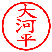 [朱肉の色]を選び、入力窓に“大河平”と入力して[生成]ボタンを押すと、印影が更新され、リンクから電子印鑑(デジタル印影)がダウンロードできます。 電子印鑑「大河平」の作り方文字表示が変なときや、文字バランスが悪いときは[字形切替]のチェックボックスでON/OFFを切り替え[生成]しなおしてください。 生成される画像は通常の印影「大河平.png」と、にじみを表現した少し太めの印影「大河平B.png」の背面透過PNG形式2種と、鮮明なPDF形式の印影「大河平.pdf」の計3種類です。 朱肉の微妙な色の違いを7色で表現しました。デフォルト(左端)は、JISが定めた朱肉の色のマンセル値(7.5R 5/14)をRGB値(217,66,54)に変換したものになっています。 「電子透かし」にチェックを入れて[生成]ボタンを押すと、タイムスタンプを透かしとして埋め込んだセキュアな電子印鑑が作れます。詳細は別ページの「電子透かしとタイムスタンプ」でご覧ください。  大河平さんの日付印が作れます。「日付スタンプメーカー」は、社内向けの書類に利用されることの多い日付印(データ印)が無料で作れるWebアプリケーションです。 中段に日付が入り、上段と下段は、ともに8文字まで文字が入ります。   古代文字で落款印が作れます。「落款スタンプメーカー」で作品を引き立たせる落款印が作れます。  なりきり書道 「落款スタンプメーカー」で作成した落款印の全体的な配置バランスの確認にご利用いただけます。デザインのワンポイントやラインスタンプ等にもお使いください。  遊び心ある大河平さんの角印はいかが? 絵文字が使えてLINEスタンプや年賀状にも使える消しゴムはんこ風の電子印鑑が作れます。  画像スタンプメーカーは、猫派の方はもちろん。犬派の方にもおすすめしたいペットなどのお気に入りの画像とかわいいタッチの文字が入るほっこりしたスタンプです。 マイスタンプメーカーとは法的な電子印鑑にはあたりませんので三文判的な位置付けでご利用ください。 | ||