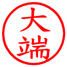 [朱肉の色]を選び、入力窓に“大端”と入力して[生成]ボタンを押すと、印影が更新され、リンクから電子印鑑(デジタル印影)がダウンロードできます。 電子印鑑「大端」の作り方文字表示が変なときや、文字バランスが悪いときは[字形切替]のチェックボックスでON/OFFを切り替え[生成]しなおしてください。 生成される画像は通常の印影「大端.png」と、にじみを表現した少し太めの印影「大端B.png」の背面透過PNG形式2種と、鮮明なPDF形式の印影「大端.pdf」の計3種類です。 朱肉の微妙な色の違いを7色で表現しました。デフォルト(左端)は、JISが定めた朱肉の色のマンセル値(7.5R 5/14)をRGB値(217,66,54)に変換したものになっています。 「電子透かし」にチェックを入れて[生成]ボタンを押すと、タイムスタンプを透かしとして埋め込んだセキュアな電子印鑑が作れます。詳細は別ページの「電子透かしとタイムスタンプ」でご覧ください。 大端さんの日付印が作れます。「日付スタンプメーカー」は、社内向けの書類に利用されることの多い日付印(データ印)が無料で作れるWebアプリケーションです。中段に日付が入り、上段と下段は、ともに8文字まで文字が入ります。 ![]() 古代文字で落款印が作れます。「落款スタンプメーカー」で作品を引き立たせる落款印が作れます。
