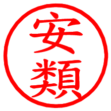[朱肉の色]を選び、入力窓に“安類”と入力して[生成]ボタンを押すと、印影が更新され、リンクから電子印鑑(デジタル印影)がダウンロードできます。 電子印鑑「安類」の作り方文字表示が変なときや、文字バランスが悪いときは[字形切替]のチェックボックスでON/OFFを切り替え[生成]しなおしてください。 生成される画像は通常の印影「安類.png」と、にじみを表現した少し太めの印影「安類B.png」の背面透過PNG形式2種と、鮮明なPDF形式の印影「安類.pdf」の計3種類です。 朱肉の微妙な色の違いを7色で表現しました。デフォルト(左端)は、JISが定めた朱肉の色のマンセル値(7.5R 5/14)をRGB値(217,66,54)に変換したものになっています。 「電子透かし」にチェックを入れて[生成]ボタンを押すと、タイムスタンプを電子透かしとして埋め込んだセキュアな電子印鑑が作れます。詳細は別ページの「タイムスタンプと電子透かし」でご覧ください。 安類さんの日付印が作れます。「日付スタンプメーカー」は、社内向けの書類に利用されることの多い日付印(データ印)が無料で作れるWebアプリケーションです。中段に日付が入り、上段と下段は、ともに8文字まで文字が入ります。 ![]() 古代文字で落款印が作れます。「落款スタンプメーカー」で作品を引き立たせる落款印が作れます。