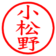 [朱肉の色]を選び、入力窓に“小松野”と入力して[生成]ボタンを押すと、印影が更新され、リンクから電子印鑑(デジタル印影)がダウンロードできます。 電子印鑑「小松野」の作り方文字表示が変なときや、文字バランスが悪いときは[字形切替]のチェックボックスでON/OFFを切り替え[生成]しなおしてください。 生成される画像は通常の印影「小松野.png」と、にじみを表現した少し太めの印影「小松野B.png」の背面透過PNG形式2種と、鮮明なPDF形式の印影「小松野.pdf」の計3種類です。 朱肉の微妙な色の違いを7色で表現しました。デフォルト(左端)は、JISが定めた朱肉の色のマンセル値(7.5R 5/14)をRGB値(217,66,54)に変換したものになっています。 「電子透かし」にチェックを入れて[生成]ボタンを押すと、タイムスタンプを透かしとして埋め込んだセキュアな電子印鑑が作れます。詳細は別ページの「電子透かしとタイムスタンプ」でご覧ください。 小松野さんの日付印が作れます。「日付スタンプメーカー」は、社内向けの書類に利用されることの多い日付印(データ印)が無料で作れるWebアプリケーションです。中段に日付が入り、上段と下段は、ともに8文字まで文字が入ります。 ![]() 古代文字で落款印が作れます。「落款スタンプメーカー」で作品を引き立たせる落款印が作れます。