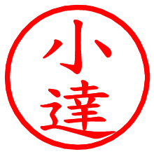 [朱肉の色]を選び、入力窓に“小達”と入力して[生成]ボタンを押すと、印影が更新され、リンクから電子印鑑(デジタル印影)がダウンロードできます。 電子印鑑「小達」の作り方文字表示が変なときや、文字バランスが悪いときは[字形切替]のチェックボックスでON/OFFを切り替え[生成]しなおしてください。 生成される画像は通常の印影「小達.png」と、にじみを表現した少し太めの印影「小達B.png」の背面透過PNG形式2種と、鮮明なPDF形式の印影「小達.pdf」の計3種類です。 朱肉の微妙な色の違いを7色で表現しました。デフォルト(左端)は、JISが定めた朱肉の色のマンセル値(7.5R 5/14)をRGB値(217,66,54)に変換したものになっています。 「電子透かし」にチェックを入れて[生成]ボタンを押すと、タイムスタンプを透かしとして埋め込んだセキュアな電子印鑑が作れます。詳細は別ページの「電子透かしとタイムスタンプ」でご覧ください。 小達さんの日付印が作れます。「日付スタンプメーカー」は、社内向けの書類に利用されることの多い日付印(データ印)が無料で作れるWebアプリケーションです。中段に日付が入り、上段と下段は、ともに8文字まで文字が入ります。 ![]() 古代文字で落款印が作れます。「落款スタンプメーカー」で作品を引き立たせる落款印が作れます。
