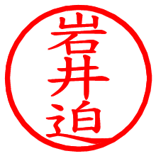 [朱肉の色]を選び、入力窓に“岩井迫”と入力して[生成]ボタンを押すと、印影が更新され、リンクから電子印鑑(デジタル印影)がダウンロードできます。 電子印鑑「岩井迫」の作り方文字表示が変なときや、文字バランスが悪いときは[字形切替]のチェックボックスでON/OFFを切り替え[生成]しなおしてください。 生成される画像は通常の印影「岩井迫.png」と、にじみを表現した少し太めの印影「岩井迫B.png」の背面透過PNG形式2種と、鮮明なPDF形式の印影「岩井迫.pdf」の計3種類です。 朱肉の微妙な色の違いを7色で表現しました。デフォルト(左端)は、JISが定めた朱肉の色のマンセル値(7.5R 5/14)をRGB値(217,66,54)に変換したものになっています。 「電子透かし」にチェックを入れて[生成]ボタンを押すと、タイムスタンプを電子透かしとして埋め込んだセキュアな電子印鑑が作れます。詳細は別ページの「タイムスタンプと電子透かし」でご覧ください。 岩井迫さんの日付印が作れます。「日付スタンプメーカー」は、社内向けの書類に利用されることの多い日付印(データ印)が無料で作れるWebアプリケーションです。中段に日付が入り、上段と下段は、ともに8文字まで文字が入ります。 ![]() 古代文字で落款印が作れます。「落款スタンプメーカー」で作品を引き立たせる落款印が作れます。