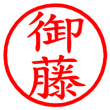 [朱肉の色]を選び、入力窓に“御藤”と入力して[生成]ボタンを押すと、印影が更新され、リンクから電子印鑑(デジタル印影)がダウンロードできます。 電子印鑑「御藤」の作り方文字表示が変なときや、文字バランスが悪いときは[字形切替]のチェックボックスでON/OFFを切り替え[生成]しなおしてください。 生成される画像は通常の印影「御藤.png」と、にじみを表現した少し太めの印影「御藤B.png」の背面透過PNG形式2種と、鮮明なPDF形式の印影「御藤.pdf」の計3種類です。 朱肉の微妙な色の違いを7色で表現しました。デフォルト(左端)は、JISが定めた朱肉の色のマンセル値(7.5R 5/14)をRGB値(217,66,54)に変換したものになっています。 「電子透かし」にチェックを入れて[生成]ボタンを押すと、タイムスタンプを電子透かしとして埋め込んだセキュアな電子印鑑が作れます。詳細は別ページの「タイムスタンプと電子透かし」でご覧ください。 御藤さんの日付印が作れます。「日付スタンプメーカー」は、社内向けの書類に利用されることの多い日付印(データ印)が無料で作れるWebアプリケーションです。中段に日付が入り、上段と下段は、ともに8文字まで文字が入ります。 ![]() 古代文字で落款印が作れます。「落款スタンプメーカー」で作品を引き立たせる落款印が作れます。