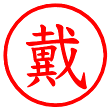 [朱肉の色]を選び、入力窓に“戴”と入力して[生成]ボタンを押すと、印影が更新され、リンクから電子印鑑(デジタル印影)がダウンロードできます。 電子印鑑「戴」の作り方文字表示が変なときや、文字バランスが悪いときは[字形切替]のチェックボックスでON/OFFを切り替え[生成]しなおしてください。 生成される画像は通常の印影「戴.png」と、にじみを表現した少し太めの印影「戴B.png」の背面透過PNG形式2種と、鮮明なPDF形式の印影「戴.pdf」の計3種類です。 朱肉の微妙な色の違いを7色で表現しました。デフォルト(左端)は、JISが定めた朱肉の色のマンセル値(7.5R 5/14)をRGB値(217,66,54)に変換したものになっています。 「電子透かし」にチェックを入れて[生成]ボタンを押すと、タイムスタンプを電子透かしとして埋め込んだセキュアな電子印鑑が作れます。詳細は別ページの「タイムスタンプと電子透かし」でご覧ください。 戴さんの日付印が作れます。「日付スタンプメーカー」は、社内向けの書類に利用されることの多い日付印(データ印)が無料で作れるWebアプリケーションです。中段に日付が入り、上段と下段は、ともに8文字まで文字が入ります。 ![]() 古代文字で落款印が作れます。「落款スタンプメーカー」で作品を引き立たせる落款印が作れます。