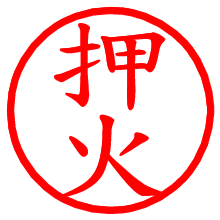 [朱肉の色]を選び、入力窓に“押火”と入力して[生成]ボタンを押すと、印影が更新され、リンクから電子印鑑(デジタル印影)がダウンロードできます。 電子印鑑「押火」の作り方文字表示が変なときや、文字バランスが悪いときは[字形切替]のチェックボックスでON/OFFを切り替え[生成]しなおしてください。 生成される画像は通常の印影「押火.png」と、にじみを表現した少し太めの印影「押火B.png」の背面透過PNG形式2種と、鮮明なPDF形式の印影「押火.pdf」の計3種類です。 朱肉の微妙な色の違いを7色で表現しました。デフォルト(左端)は、JISが定めた朱肉の色のマンセル値(7.5R 5/14)をRGB値(217,66,54)に変換したものになっています。 「電子透かし」にチェックを入れて[生成]ボタンを押すと、タイムスタンプを電子透かしとして埋め込んだセキュアな電子印鑑が作れます。詳細は別ページの「タイムスタンプと電子透かし」でご覧ください。 押火さんの日付印が作れます。「日付スタンプメーカー」は、社内向けの書類に利用されることの多い日付印(データ印)が無料で作れるWebアプリケーションです。中段に日付が入り、上段と下段は、ともに8文字まで文字が入ります。 ![]() 古代文字で落款印が作れます。「落款スタンプメーカー」で作品を引き立たせる落款印が作れます。