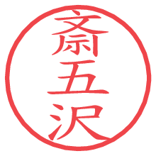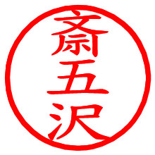 [朱肉の色]を選び、入力窓に“斎五沢”と入力して[生成]ボタンを押すと、印影が更新され、リンクから電子印鑑(デジタル印影)がダウンロードできます。 電子印鑑「斎五沢」の作り方文字表示が変なときや、文字バランスが悪いときは[字形切替]のチェックボックスでON/OFFを切り替え[生成]しなおしてください。 生成される画像は通常の印影「斎五沢.png」と、にじみを表現した少し太めの印影「斎五沢B.png」の背面透過PNG形式2種と、鮮明なPDF形式の印影「斎五沢.pdf」の計3種類です。 朱肉の微妙な色の違いを7色で表現しました。デフォルト(左端)は、JISが定めた朱肉の色のマンセル値(7.5R 5/14)をRGB値(217,66,54)に変換したものになっています。 「電子透かし」にチェックを入れて[生成]ボタンを押すと、タイムスタンプを電子透かしとして埋め込んだセキュアな電子印鑑が作れます。詳細は別ページの「タイムスタンプと電子透かし」でご覧ください。 斎五沢さんの日付印が作れます。「日付スタンプメーカー」は、社内向けの書類に利用されることの多い日付印(データ印)が無料で作れるWebアプリケーションです。中段に日付が入り、上段と下段は、ともに8文字まで文字が入ります。 ![]() 古代文字で落款印が作れます。「落款スタンプメーカー」で作品を引き立たせる落款印が作れます。