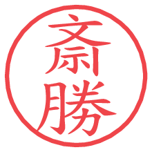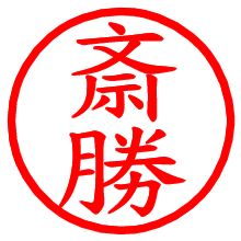 [朱肉の色]を選び、入力窓に“斎勝”と入力して[生成]ボタンを押すと、印影が更新され、リンクから電子印鑑(デジタル印影)がダウンロードできます。 電子印鑑「斎勝」の作り方文字表示が変なときや、文字バランスが悪いときは[字形切替]のチェックボックスでON/OFFを切り替え[生成]しなおしてください。 生成される画像は通常の印影「斎勝.png」と、にじみを表現した少し太めの印影「斎勝B.png」の背面透過PNG形式2種と、鮮明なPDF形式の印影「斎勝.pdf」の計3種類です。 朱肉の微妙な色の違いを7色で表現しました。デフォルト(左端)は、JISが定めた朱肉の色のマンセル値(7.5R 5/14)をRGB値(217,66,54)に変換したものになっています。 「電子透かし」にチェックを入れて[生成]ボタンを押すと、タイムスタンプを電子透かしとして埋め込んだセキュアな電子印鑑が作れます。詳細は別ページの「タイムスタンプと電子透かし」でご覧ください。 斎勝さんの日付印が作れます。「日付スタンプメーカー」は、社内向けの書類に利用されることの多い日付印(データ印)が無料で作れるWebアプリケーションです。中段に日付が入り、上段と下段は、ともに8文字まで文字が入ります。 ![]() 古代文字で落款印が作れます。「落款スタンプメーカー」で作品を引き立たせる落款印が作れます。