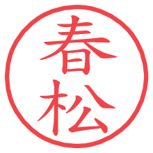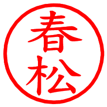 [朱肉の色]を選び、入力窓に“春松”と入力して[生成]ボタンを押すと、印影が更新され、リンクから電子印鑑(デジタル印影)がダウンロードできます。 電子印鑑「春松」の作り方文字表示が変なときや、文字バランスが悪いときは[字形切替]のチェックボックスでON/OFFを切り替え[生成]しなおしてください。 生成される画像は通常の印影「春松.png」と、にじみを表現した少し太めの印影「春松B.png」の背面透過PNG形式2種と、鮮明なPDF形式の印影「春松.pdf」の計3種類です。 朱肉の微妙な色の違いを7色で表現しました。デフォルト(左端)は、JISが定めた朱肉の色のマンセル値(7.5R 5/14)をRGB値(217,66,54)に変換したものになっています。 「電子透かし」にチェックを入れて[生成]ボタンを押すと、タイムスタンプを電子透かしとして埋め込んだセキュアな電子印鑑が作れます。詳細は別ページの「タイムスタンプと電子透かし」でご覧ください。 春松さんの日付印が作れます。「日付スタンプメーカー」は、社内向けの書類に利用されることの多い日付印(データ印)が無料で作れるWebアプリケーションです。中段に日付が入り、上段と下段は、ともに8文字まで文字が入ります。 ![]() 古代文字で落款印が作れます。「落款スタンプメーカー」で作品を引き立たせる落款印が作れます。