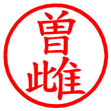 [朱肉の色]を選び、入力窓に“曽雌”と入力して[生成]ボタンを押すと、印影が更新され、リンクから電子印鑑(デジタル印影)がダウンロードできます。 電子印鑑「曽雌」の作り方文字表示が変なときや、文字バランスが悪いときは[字形切替]のチェックボックスでON/OFFを切り替え[生成]しなおしてください。 生成される画像は通常の印影「曽雌.png」と、にじみを表現した少し太めの印影「曽雌B.png」の背面透過PNG形式2種と、鮮明なPDF形式の印影「曽雌.pdf」の計3種類です。 朱肉の微妙な色の違いを7色で表現しました。デフォルト(左端)は、JISが定めた朱肉の色のマンセル値(7.5R 5/14)をRGB値(217,66,54)に変換したものになっています。 「電子透かし」にチェックを入れて[生成]ボタンを押すと、タイムスタンプを透かしとして埋め込んだセキュアな電子印鑑が作れます。詳細は別ページの「電子透かしとタイムスタンプ」でご覧ください。 曽雌さんの日付印が作れます。「日付スタンプメーカー」は、社内向けの書類に利用されることの多い日付印(データ印)が無料で作れるWebアプリケーションです。中段に日付が入り、上段と下段は、ともに8文字まで文字が入ります。 ![]() 古代文字で落款印が作れます。「落款スタンプメーカー」で作品を引き立たせる落款印が作れます。