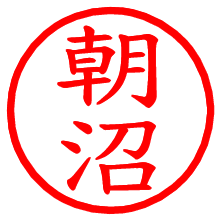 [朱肉の色]を選び、入力窓に“朝沼”と入力して[生成]ボタンを押すと、印影が更新され、リンクから電子印鑑(デジタル印影)がダウンロードできます。 電子印鑑「朝沼」の作り方文字表示が変なときや、文字バランスが悪いときは[字形切替]のチェックボックスでON/OFFを切り替え[生成]しなおしてください。 生成される画像は通常の印影「朝沼.png」と、にじみを表現した少し太めの印影「朝沼B.png」の背面透過PNG形式2種と、鮮明なPDF形式の印影「朝沼.pdf」の計3種類です。 朱肉の微妙な色の違いを7色で表現しました。デフォルト(左端)は、JISが定めた朱肉の色のマンセル値(7.5R 5/14)をRGB値(217,66,54)に変換したものになっています。 「電子透かし」にチェックを入れて[生成]ボタンを押すと、タイムスタンプを電子透かしとして埋め込んだセキュアな電子印鑑が作れます。詳細は別ページの「タイムスタンプと電子透かし」でご覧ください。 朝沼さんの日付印が作れます。「日付スタンプメーカー」は、社内向けの書類に利用されることの多い日付印(データ印)が無料で作れるWebアプリケーションです。中段に日付が入り、上段と下段は、ともに8文字まで文字が入ります。 ![]() 古代文字で落款印が作れます。「落款スタンプメーカー」で作品を引き立たせる落款印が作れます。
