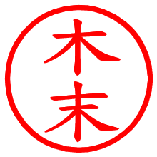 [朱肉の色]を選び、入力窓に“木末”と入力して[生成]ボタンを押すと、印影が更新され、リンクから電子印鑑(デジタル印影)がダウンロードできます。 電子印鑑「木末」の作り方文字表示が変なときや、文字バランスが悪いときは[字形切替]のチェックボックスでON/OFFを切り替え[生成]しなおしてください。 生成される画像は通常の印影「木末.png」と、にじみを表現した少し太めの印影「木末B.png」の背面透過PNG形式2種と、鮮明なPDF形式の印影「木末.pdf」の計3種類です。 朱肉の微妙な色の違いを7色で表現しました。デフォルト(左端)は、JISが定めた朱肉の色のマンセル値(7.5R 5/14)をRGB値(217,66,54)に変換したものになっています。 「電子透かし」にチェックを入れて[生成]ボタンを押すと、タイムスタンプを電子透かしとして埋め込んだセキュアな電子印鑑が作れます。詳細は別ページの「タイムスタンプと電子透かし」でご覧ください。 木末さんの日付印が作れます。「日付スタンプメーカー」は、社内向けの書類に利用されることの多い日付印(データ印)が無料で作れるWebアプリケーションです。中段に日付が入り、上段と下段は、ともに8文字まで文字が入ります。 ![]() 古代文字で落款印が作れます。「落款スタンプメーカー」で作品を引き立たせる落款印が作れます。
