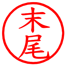[朱肉の色]を選び、入力窓に“末尾”と入力して[生成]ボタンを押すと、印影が更新され、リンクから電子印鑑(デジタル印影)がダウンロードできます。 電子印鑑「末尾」の作り方文字表示が変なときや、文字バランスが悪いときは[字形切替]のチェックボックスでON/OFFを切り替え[生成]しなおしてください。 生成される画像は通常の印影「末尾.png」と、にじみを表現した少し太めの印影「末尾B.png」の背面透過PNG形式2種と、鮮明なPDF形式の印影「末尾.pdf」の計3種類です。 朱肉の微妙な色の違いを7色で表現しました。デフォルト(左端)は、JISが定めた朱肉の色のマンセル値(7.5R 5/14)をRGB値(217,66,54)に変換したものになっています。 「電子透かし」にチェックを入れて[生成]ボタンを押すと、タイムスタンプを電子透かしとして埋め込んだセキュアな電子印鑑が作れます。詳細は別ページの「タイムスタンプと電子透かし」でご覧ください。 末尾さんの日付印が作れます。「日付スタンプメーカー」は、社内向けの書類に利用されることの多い日付印(データ印)が無料で作れるWebアプリケーションです。中段に日付が入り、上段と下段は、ともに8文字まで文字が入ります。 ![]() 古代文字で落款印が作れます。「落款スタンプメーカー」で作品を引き立たせる落款印が作れます。