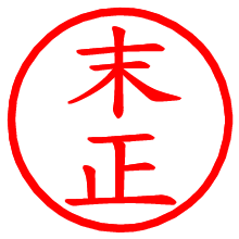 [朱肉の色]を選び、入力窓に“末正”と入力して[生成]ボタンを押すと、印影が更新され、リンクから電子印鑑(デジタル印影)がダウンロードできます。 電子印鑑「末正」の作り方文字表示が変なときや、文字バランスが悪いときは[字形切替]のチェックボックスでON/OFFを切り替え[生成]しなおしてください。 生成される画像は通常の印影「末正.png」と、にじみを表現した少し太めの印影「末正B.png」の背面透過PNG形式2種と、鮮明なPDF形式の印影「末正.pdf」の計3種類です。 朱肉の微妙な色の違いを7色で表現しました。デフォルト(左端)は、JISが定めた朱肉の色のマンセル値(7.5R 5/14)をRGB値(217,66,54)に変換したものになっています。 「電子透かし」にチェックを入れて[生成]ボタンを押すと、タイムスタンプを電子透かしとして埋め込んだセキュアな電子印鑑が作れます。詳細は別ページの「タイムスタンプと電子透かし」でご覧ください。 末正さんの日付印が作れます。「日付スタンプメーカー」は、社内向けの書類に利用されることの多い日付印(データ印)が無料で作れるWebアプリケーションです。中段に日付が入り、上段と下段は、ともに8文字まで文字が入ります。 ![]() 古代文字で落款印が作れます。「落款スタンプメーカー」で作品を引き立たせる落款印が作れます。
