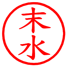 [朱肉の色]を選び、入力窓に“末水”と入力して[生成]ボタンを押すと、印影が更新され、リンクから電子印鑑(デジタル印影)がダウンロードできます。 電子印鑑「末水」の作り方文字表示が変なときや、文字バランスが悪いときは[字形切替]のチェックボックスでON/OFFを切り替え[生成]しなおしてください。 生成される画像は通常の印影「末水.png」と、にじみを表現した少し太めの印影「末水B.png」の背面透過PNG形式2種と、鮮明なPDF形式の印影「末水.pdf」の計3種類です。 朱肉の微妙な色の違いを7色で表現しました。デフォルト(左端)は、JISが定めた朱肉の色のマンセル値(7.5R 5/14)をRGB値(217,66,54)に変換したものになっています。 「電子透かし」にチェックを入れて[生成]ボタンを押すと、タイムスタンプを電子透かしとして埋め込んだセキュアな電子印鑑が作れます。詳細は別ページの「タイムスタンプと電子透かし」でご覧ください。 末水さんの日付印が作れます。「日付スタンプメーカー」は、社内向けの書類に利用されることの多い日付印(データ印)が無料で作れるWebアプリケーションです。中段に日付が入り、上段と下段は、ともに8文字まで文字が入ります。 ![]() 古代文字で落款印が作れます。「落款スタンプメーカー」で作品を引き立たせる落款印が作れます。