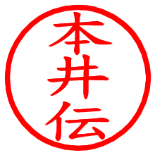 [朱肉の色]を選び、入力窓に“本井伝”と入力して[生成]ボタンを押すと、印影が更新され、リンクから電子印鑑(デジタル印影)がダウンロードできます。 電子印鑑「本井伝」の作り方文字表示が変なときや、文字バランスが悪いときは[字形切替]のチェックボックスでON/OFFを切り替え[生成]しなおしてください。 生成される画像は通常の印影「本井伝.png」と、にじみを表現した少し太めの印影「本井伝B.png」の背面透過PNG形式2種と、鮮明なPDF形式の印影「本井伝.pdf」の計3種類です。 朱肉の微妙な色の違いを7色で表現しました。デフォルト(左端)は、JISが定めた朱肉の色のマンセル値(7.5R 5/14)をRGB値(217,66,54)に変換したものになっています。 「電子透かし」にチェックを入れて[生成]ボタンを押すと、タイムスタンプを電子透かしとして埋め込んだセキュアな電子印鑑が作れます。詳細は別ページの「タイムスタンプと電子透かし」でご覧ください。 本井伝さんの日付印が作れます。「日付スタンプメーカー」は、社内向けの書類に利用されることの多い日付印(データ印)が無料で作れるWebアプリケーションです。中段に日付が入り、上段と下段は、ともに8文字まで文字が入ります。 ![]() 古代文字で落款印が作れます。「落款スタンプメーカー」で作品を引き立たせる落款印が作れます。